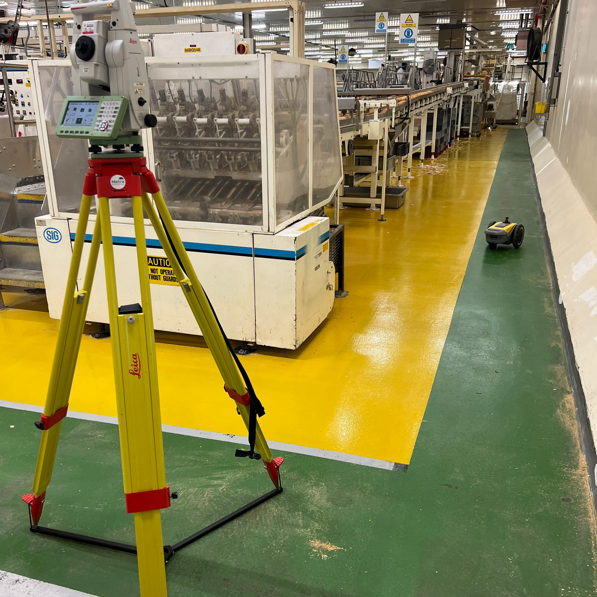 One of the main advantages of the SitePrint system is its ability to work safely beneath and around live equipment. The robot navigated under active packaging lines and tight spaces, maintaining full accuracy and allowing the factory to continue production throughout the operation. This would have been extremely difficult to achieve using manual stakeout/set out methods.